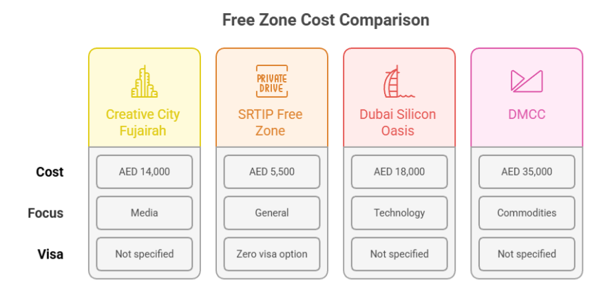 Fujairah Free Zone company setup begins at AED 21,500 for a zero-visa licence with virtual office facilities. This compares favourably against Dubai Silicon Oasis (AED 18,000+), DMCC (AED 35,000+), and similar premium zones. The pricing makes market entry in the UAE accessible for bootstrapped startups and SMEs operating lean financial models.