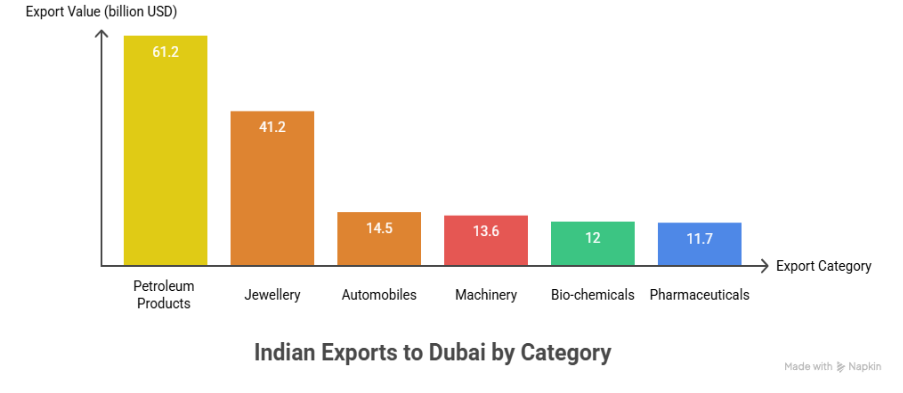 Now that we know the reasons that make Dubai an attractive destination for Indian traders, let’s examine which specific sectors offer the greatest potential. The overall trade between India and the UAE reached a record $100.06 billion in FY25, with several key industries driving this growth.